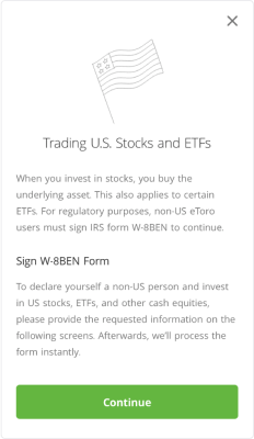 If non-US users want to trade on eToro and invest in US stocks, they need to sign IRS form W-8BEN to be able to do that.