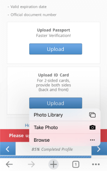 First, you'll need your ID card or passport. If you go with your ID, you must take a photo of the front and back of the card as well. You can upload an existing photo, or simply enable your phone camera and take a fresh picture.