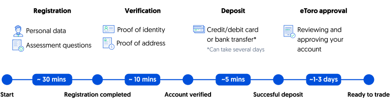 Registration, account verification and making your first deposit takes about 45 minutes to complete. After that, it usually takes a few days for eToro to approve your registration.